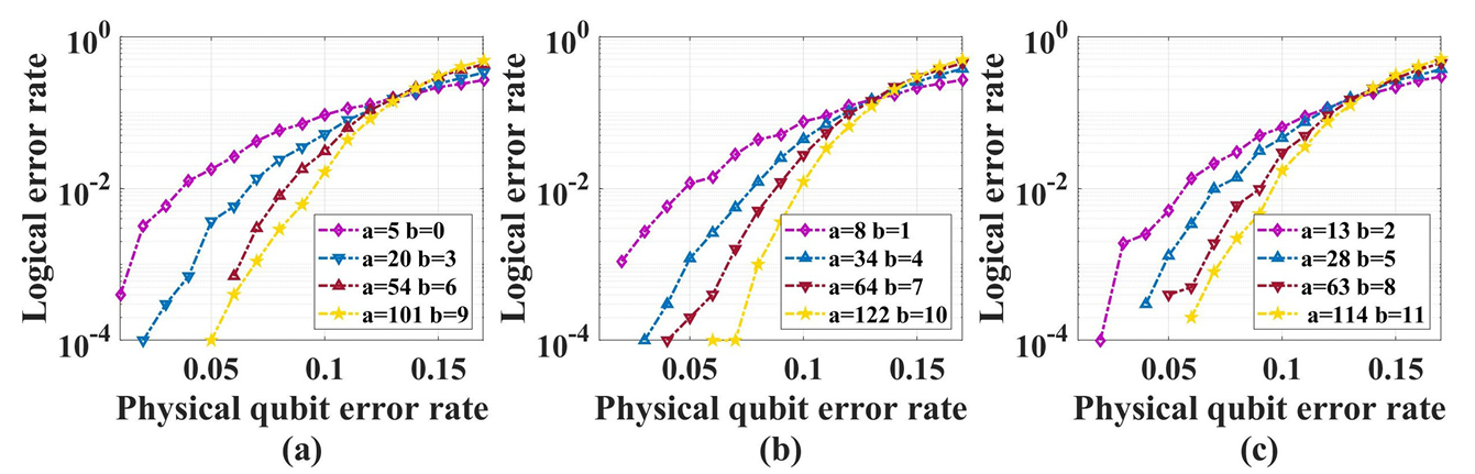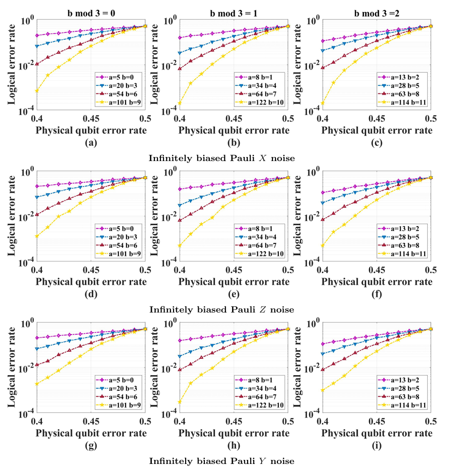 图(b):在强偏置噪声下(Pauli Z错误偏置比1000),阈值可达49%