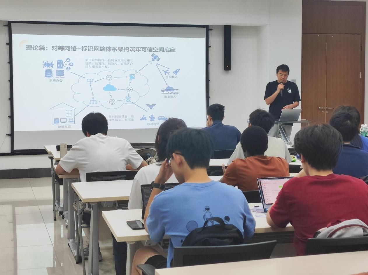 张鹏以《新一代可信网络与普适化服务体系》为题展开报告。他首先指出,尽管互联网数字化服务日益发达,但诸如电子病历等敏感数据仍难以安全、直接地交付至用户手中,其根本原因在于传统网络架构在隐私保护与数据可信流通方面存在固有缺陷。随后,他系统介绍了基于张宏科院士“标识网络”理论的新一代可信网络与普适化服务体系框架,重点阐述了其如何通过对等网络、QUIC协议、统一身份验证、本地网关等关键技术,实现数据“可用不可见”、端到端加密通信、身份可信认证与多方签名追溯等核心能力。张鹏还展示了该体系在电子病历安全传递、家庭算力中心、高校算力共享等实际场景中的应用潜力,强调其具备高兼容性、低改造成本与强安全性等重要优势。报告结束后,现场师生与张鹏就可信网络构建及相关技术落地等问题展开了热烈讨论。
