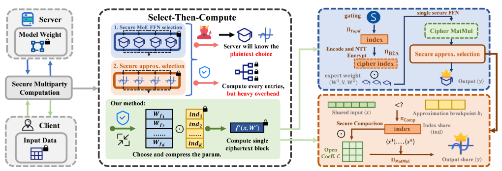 论文简介:隐私保护的 Transformer 推理由于潜在的敏感信息泄露风险而受到广泛关注。尽管近年来已经取得一定进展,但现有框架在模型参数量级方面与明文模型相比仍显不足,差距最高可达百倍。弥合这一差距的一个潜在方向是Mixture of Experts(MoE)架构,它已成为一种在仅增加极小开销的情况下扩展模型容量的有前景技术。然而,在当前安全两方计算(2-PC)混合协议中,在基于同态计算的线性层运算下被激活专家索引会被泄露给服务器,从而泄露关于客户端输入token级隐私。
