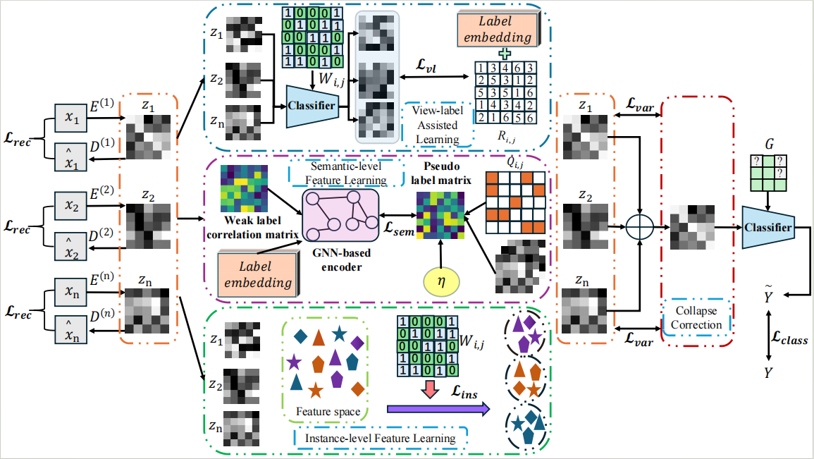 由于数据收集和标注可靠性的限制,多视角数据的缺失会削弱对样本的全面理解,不完整的多视角多标签分类面临严峻挑战。为了解决这个问题,作者提出了一种多视角互补学习框架MC-IVLC,以充分挖掘不同视角之间的互补信息。具体而言,MC-IVLC旨在补偿重构特征的坍塌,并显式地使用融合特征作为监督信号来指导缺失视角的补全。此外,MC-IVLC从实例和语义两个层面充分利用了视角之间的互补关系。实例层面的对比学习旨在促进同一视角中相似特征的聚类,从而增强跨视角特征的互补性。语义层面的对比学习利用伪标签来推断标签嵌入中缺失的标签。它将伪标签的语义信息与特征嵌入相结合,以指导跨视角特征的语义相关性。最后,MC-IVLC显式编码了视图标识,并引入了视图标签预测损失项,以增强对视图信息的感知,并对齐单个视图和多个视图,进一步探索视图和标签之间的内在联系。我们在五个广泛使用的数据集上进行了实验。实验结果表明,与现有最佳方法相比,MC-IVLC取得了优异的性能。