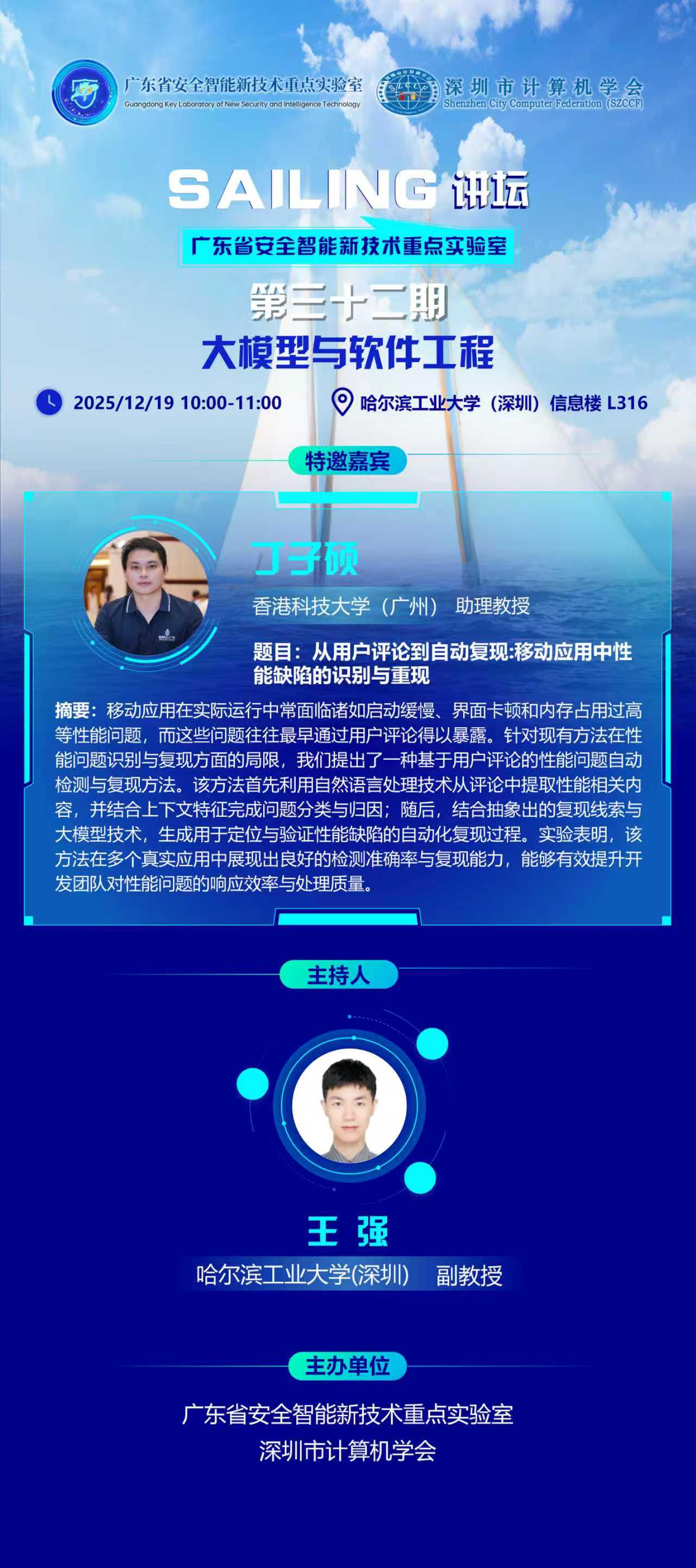 SAILING讲坛第三十二期【大模型与软件工程】将于2025年12月19日上午10:00-11:00在哈尔滨工业大学(深圳)信息楼L316举办。本期将有特邀嘉宾香港科技大学(广州)助理教授丁子硕为我们做前沿的技术分享。