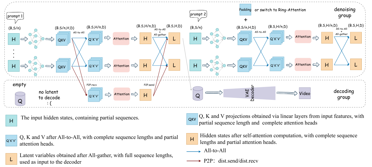 论文简介:视频生成技术近年来发展迅速,基于扩散Transformer(DiT)的视频生成模型(包括扩散模块和VAE生成模块)已展现出卓越的能力。然而,它们在实际应用中的部署仍常受到推理速度慢与内存消耗高的限制。为此,本文提出了一种名为 PipeDiT 的全新流水线加速框架,用于提升视频生成的效率。该框架包含三项核心创新。首先,本文提出了一种用于序列并行(SP)的流水线算法 PipeSP,使潜变量生成过程的计算与多 GPU 间的通信能够并行流水执行,从而降低推理延迟。其次,提出DeDiVAE 方法,将扩散模块与 VAE 模块解耦为两个 GPU 组,并将它们的执行过程进行流水化,以减少内存占用并进一步降低推理延迟。第三,为了更充分地利用 VAE 组中的 GPU 资源,本文提出了一种注意力协同处理(Aco)方法,进一步降低整体视频生成的延迟。