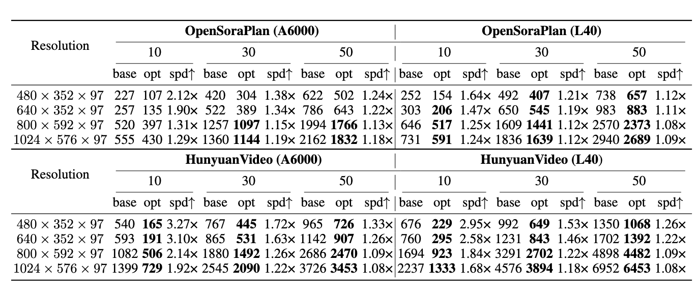 本文将PipeDiT 集成到两个先进的开源视频生成框架——OpenSoraPlan和 HunyuanVideo中,并在两个8-GPU系统上进行了大量实验。实验结果表明,在多种常见分辨率和时间步配置下,PipeDiT相较于OpenSoraPlan和HunyuanVideo能实现1.06×到4.02×的加速效果。