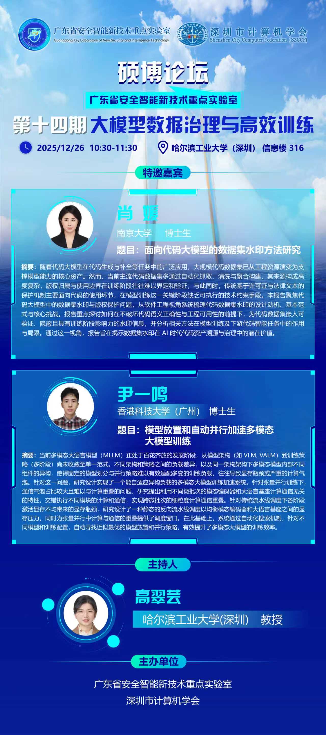 【文章导读】广东省安全智能新技术重点实验室硕博论坛第十四期【大模型数据治理与高效训练】将于2025年12月26日上午10:30-11:30在哈尔滨工业大学(深圳)信息楼L316举办。本期将有南京大学博士生肖媛、香港科技大学(广州)尹一鸣博士生为我们做前沿的技术分享。