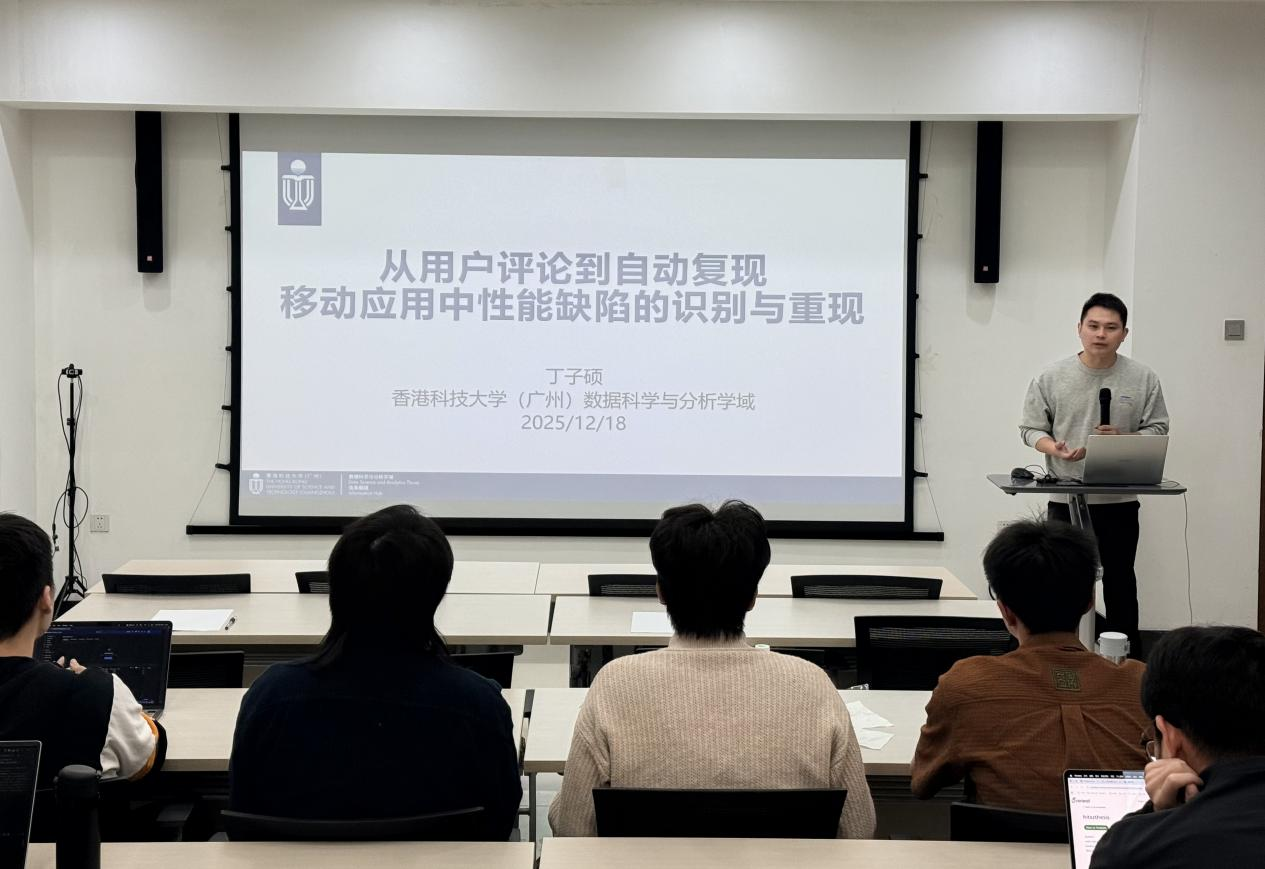 丁子硕老师以《从用户评论到自动复现:移动应用中性能缺陷的识别与重现》为题展开报告。他首先指出,移动应用市场规模庞大但性能问题频发,卡顿、耗电、启动缓慢等问题直接影响用户留存与品牌信誉,而传统检测方法面临触发条件复杂、人工排查耗时费力等挑战,海量用户评论中蕴含的有效反馈未被充分挖掘。随后,他详细介绍了基于大模型的LARFP自动化复现框架,该框架通过用户评论处理与增强、操作策略生成与执行、性能异常自动检测三个核心阶段,整合语义检索、智能代理等技术,实现从非结构化评论到性能问题复现的全流程自动化。丁老师展示了框架的实践成效,其成功复现率达55%,平均复现耗时仅137.8秒,大幅提升问题排查效率,为企业降低开发运维成本。报告结束后,现场师生围绕复现框架技术细节、未来优化方向等问题与丁子硕老师展开了热烈讨论。